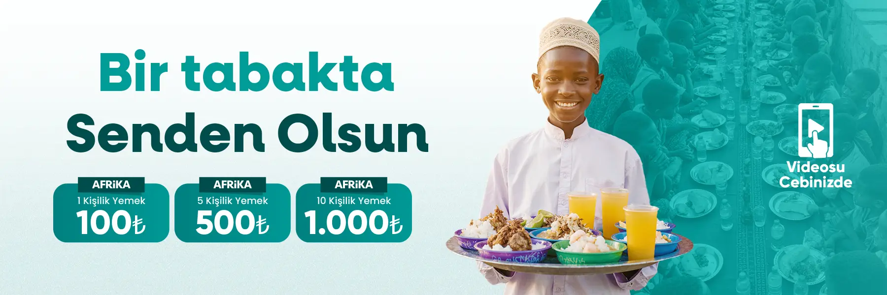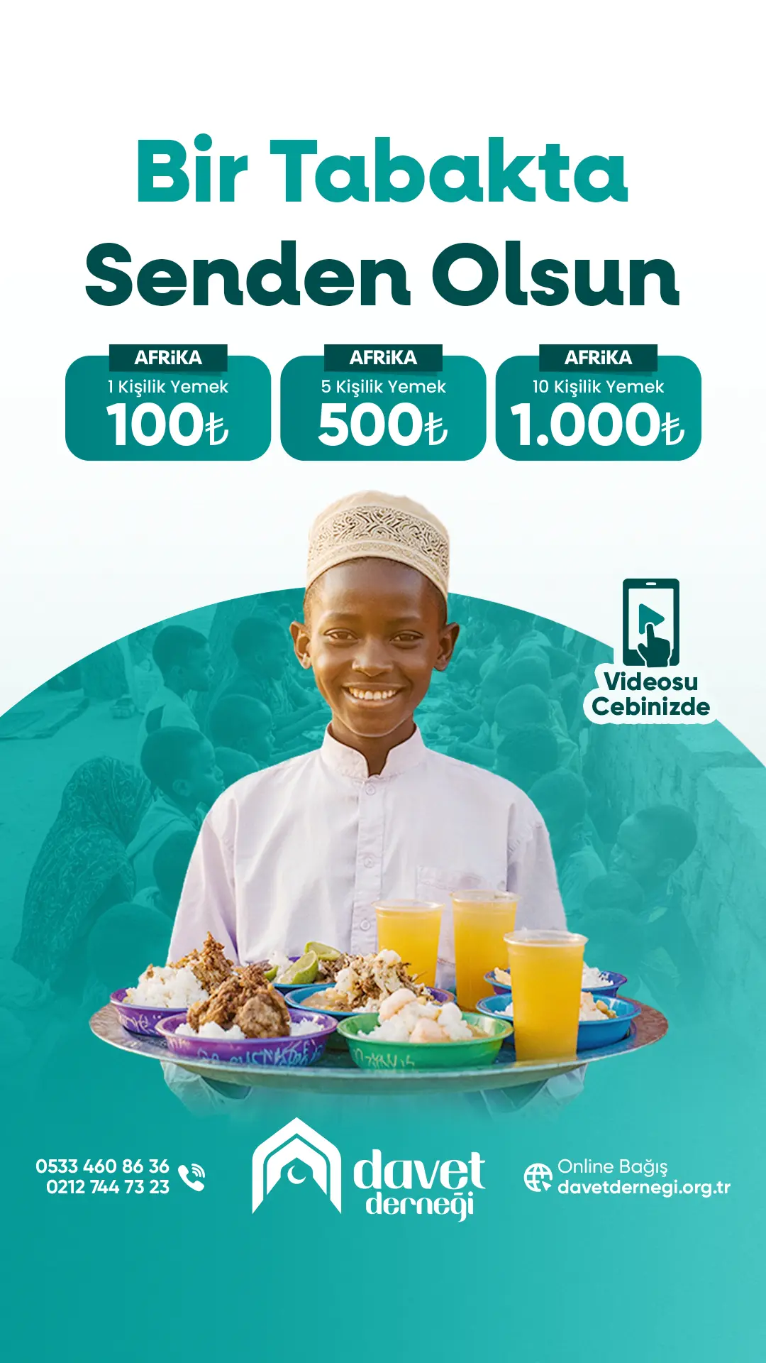 Davet derneği, Afrika’nın açlık kuraklık ve yoksulluk ile mücadele eden bölgelerinde sizlerin destekleriyle iftar sofraları kuruyor. “bir tabakta senden olsun” sloganı ile çıktığımız yolda her hafta iftar / yemek sofraları kurarak bölgedeki ihtiyaç sahiplerine kurarken sizlere de bu mutluluğun videolarını ulaştırıyoruz.